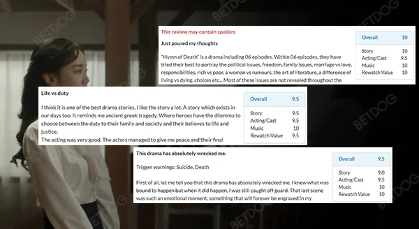 เดอะฮิมออฟเดธ สนุกไหม ก่อนอื่นซีรีส์เรื่องนี้มีชื่อภาษาอังกฤษว่า “The Hymn of Death” เป็นซีรีส์ทางโทรทัศน์ของเกาหลีใต้ ที่ออกอากาศทางช่อง SBS เมื่อวันที่ 27 พฤศจิกายน ไปจนถึง 4 ธันวาคม 2018 [1] ก่อนหน้า The Nokdu Flower
